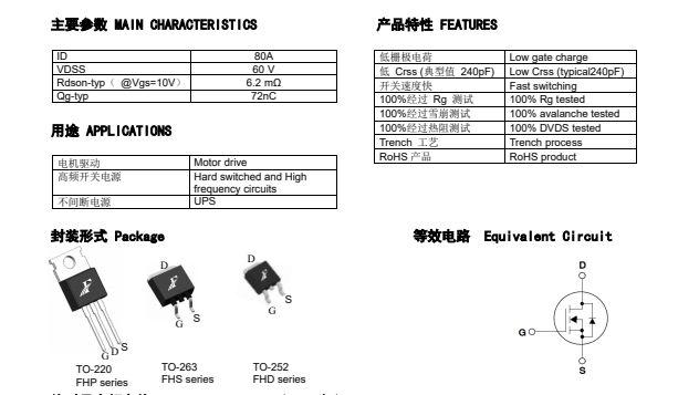 FHP60N1F10A具有60A、100V, RDS(on) = 12mΩ(max) @VGS =±20 V,具備100% EAS測試,UPS不間斷電源電路用mos管100% Rg測試,電機(jī)驅(qū)動用mos管100% DVDS測試,極低的FOM(RDSON*Qg),極低的輸入電容的特點(diǎn)。