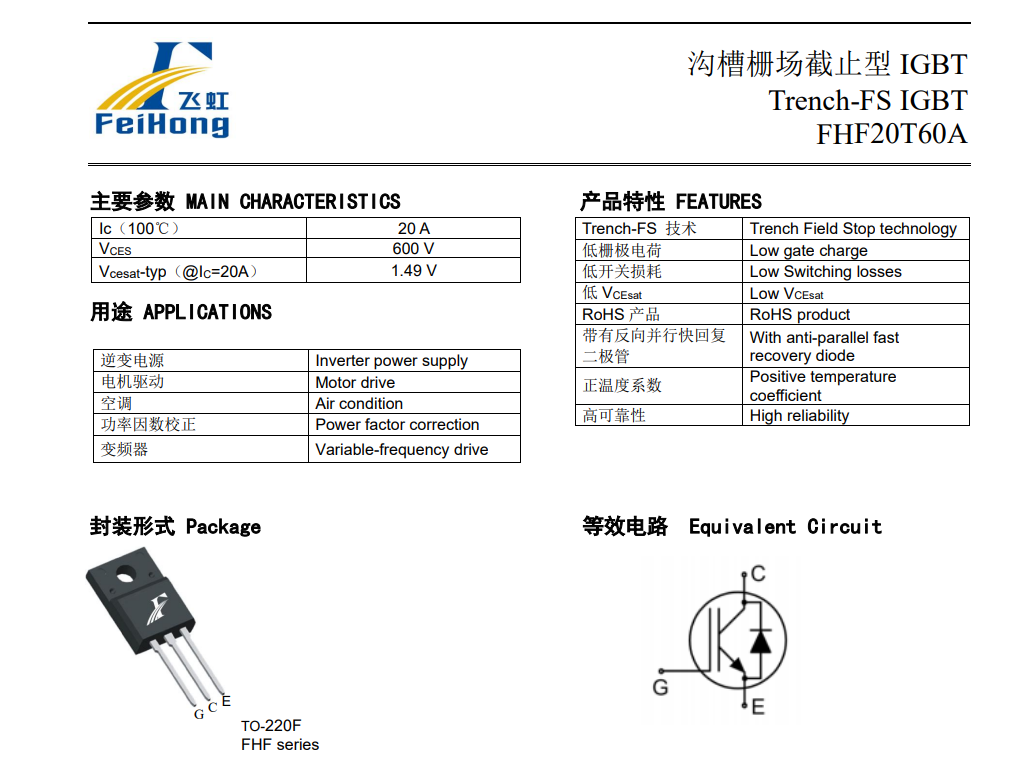 目前飛虹半導體的FHF20T60A型號IGBT產(chǎn)品參數(shù)特點為: